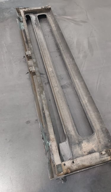 Hemos recibido en el taller de Reforzado con Fibra un paragolpes completamente fracturado por ambas partes. El trabajo ha consistido en su reconstrucción, alineación y acople correcto a la estructura metálica del camión. Tras fijar las zonas dañadas, se aplicó una capa de acabado en negro para uniformar el conjunto y dejar la pieza lista para su uso.